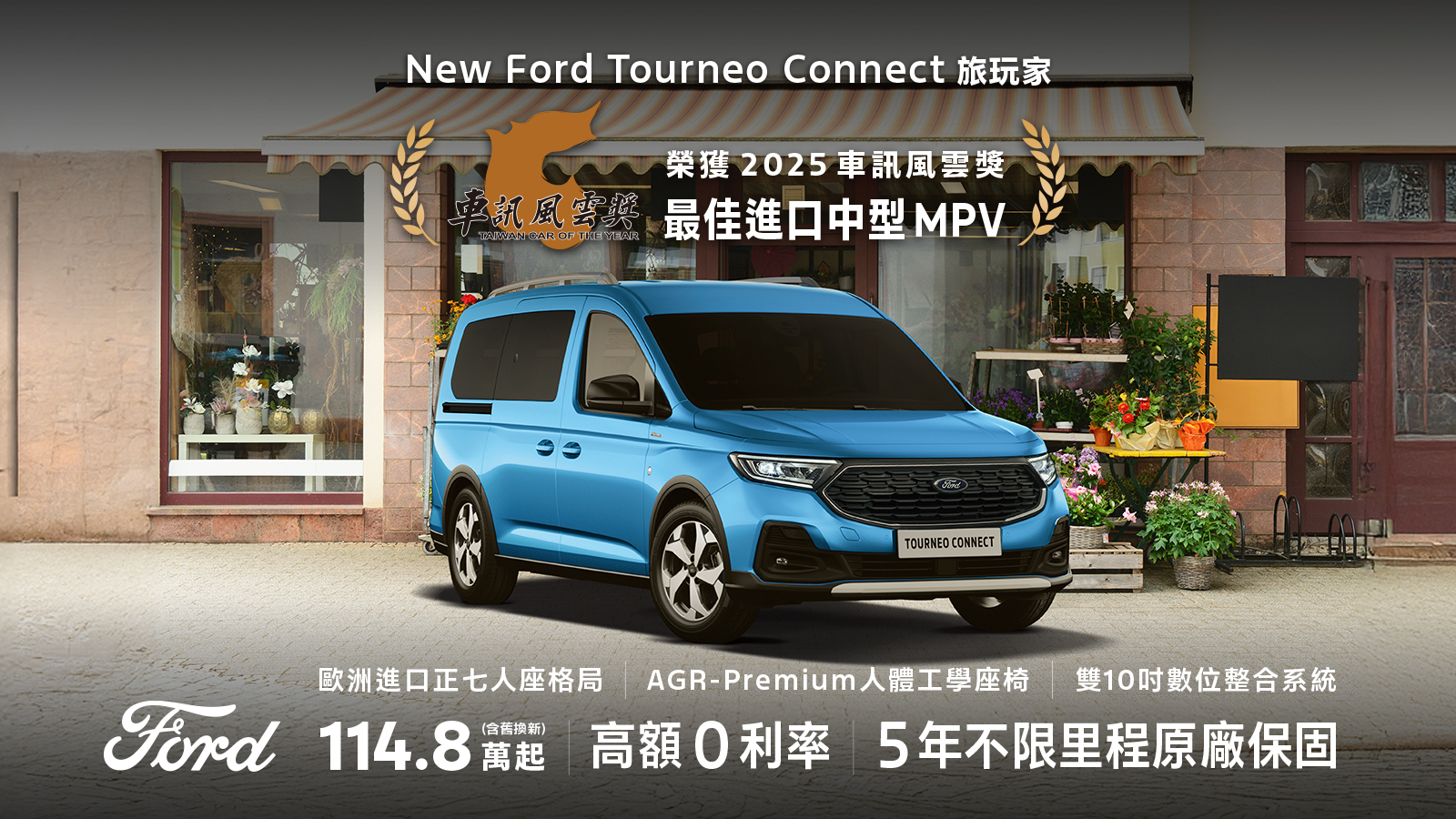 德製性能鋼砲New Ford Focus ST 25年式,先馳德點享148.9萬元起;New Ford Tourneo Connect福特旅玩家享高額0利率,再加碼5年不限里程原廠保固。