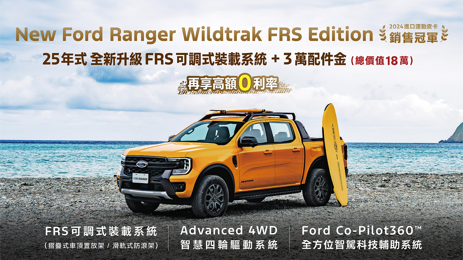 New Ford Ranger全新25年式車型Wildtrak FRS Edition,升級FRS可調式裝載系統,並享3萬元配件金,提供總價值18萬元的配備升級幅度,再享高額0利率優惠。盛夏超值購車優惠限時開跑中,敬請把握機會輕鬆入主Ford好車,讓Ford陪您暢享夏日駕馭樂趣。
