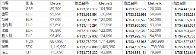 Lotus Eletre首批將在英國販售,預計2023上半年就可以開始交車,以下列出另外八個主要歐洲地區的訂價,Lotus也表示Eletre將在2024年陸續進入北美、中東、亞太以及其他地區。