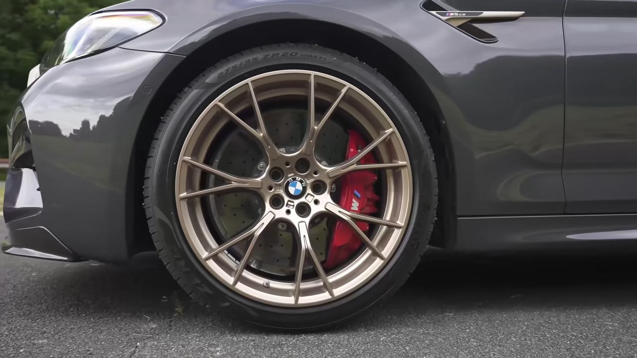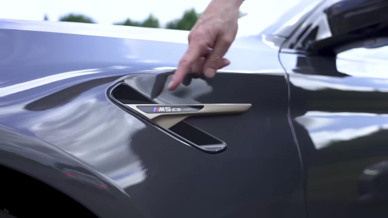BMW M5 CS是基於一般的BMW 5系列打造而來,換上20吋的金色鋁圈、更大的煞車卡鉗、碳纖維車頂,以及車側有一個CS的銘牌。在車尾部分有著不少碳纖維配件點綴,以及銅色的專屬銘牌,來到車頭有著更多銅色配件。車高部分,很明顯M5 CS比一般的五系列都還要更貼近地面。