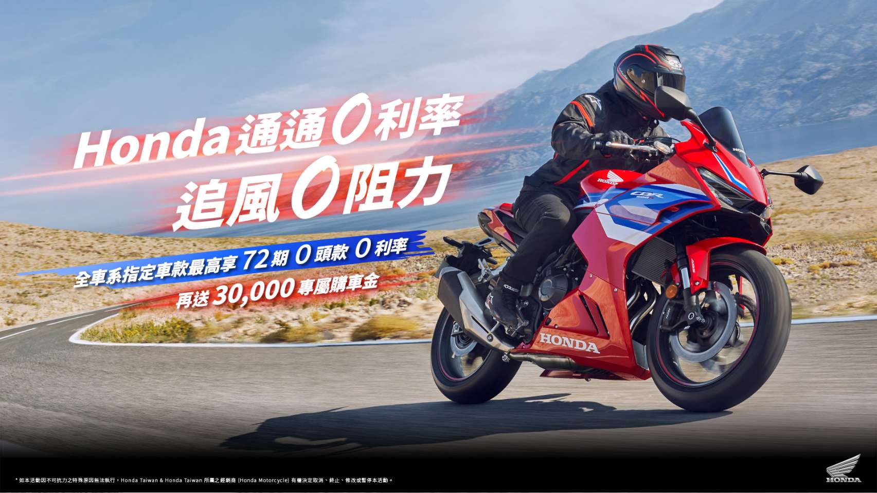再針對多款人氣機種提供超值的「通通零利率 追風零阻力」專案,全車系指定車款最高享72期、0頭款、0利率 再送3萬專屬購車金,不論是日常通勤、假日出遊或冒險壯遊,都能無壓力且無負擔入主Honda人氣二輪機種,享受專屬於騎士的馳騁自由。