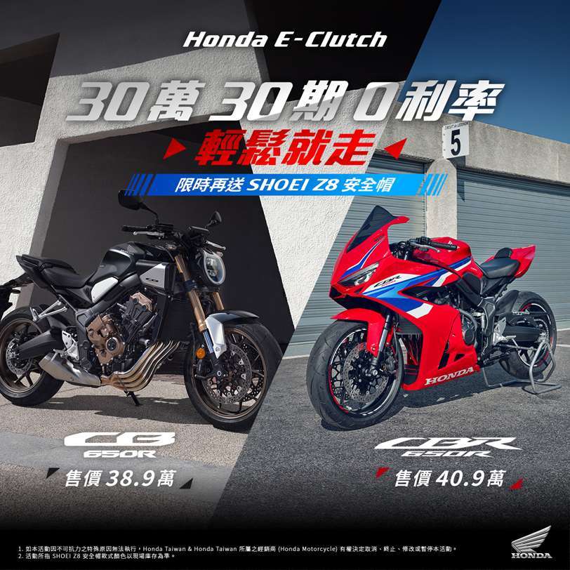 騎旅機能版(含專屬側箱組、專用支架、鋁合金面板 價值:45,860)再享72期,零頭款、零利率之外,再送三萬元購車金,搭載科技新潮流的CB650R E-Clutch以及CBR650R E-Clutch,享30萬、30期 0利率優惠,限時再送Shoei Z-8安全帽,為所有騎士帶來前所未有的輕鬆駕馭體驗。